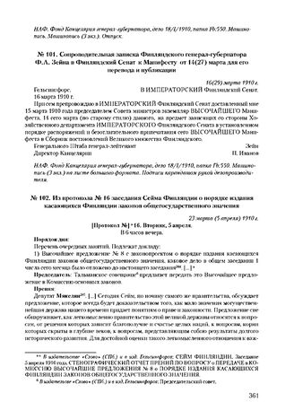 Сопроводительная записка Финляндского генерал-губернатора Ф.А. Зейна в Финляндский Сенат к Манифесту от 14(27) марта для его перевода и публикации. 16(29) марта 1910 г. // НАФ. Фонд Канцелярия генерал-губернатора, дело 18/I/1910, папка Fb:550. Машинопись.