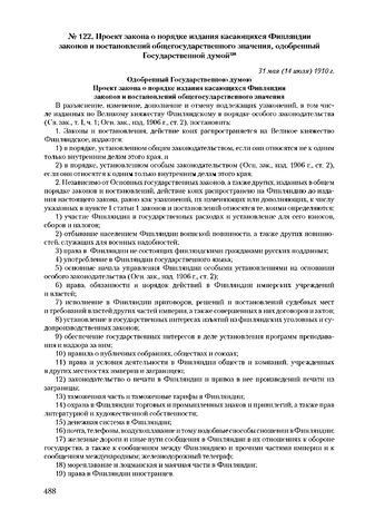 Проект закона о порядке издания касающихся Финляндии законов и постановлений общегосударственного значения, одобренный Государственной думой. 31 мая (14 июля) 1910 г.