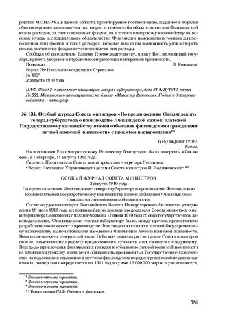 Особый журнал Совета министров «По предложениям Финляндского генерал-губернатора о производстве Финляндской казною платежей Государственному казначейству взамен отбывания финляндскими гражданами личной воинской повинности» с проектом постановления. 3(16) августа 1910 г.