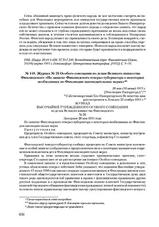 Журнал № 26 Особого совещания по делам Великого княжества Финляндского «По записке Финляндского генерал-губернатора о некоторых необходимых по Финляндии законодательных мерах». 28 мая (10 июня) 1911 г.