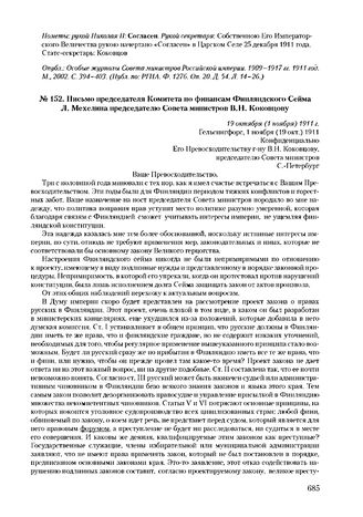 Письмо председателя Комитета по финансам Финляндского Сейма Л. Мехелина председателю Совета министров В.Н. Коковцеву. 19 октября (1 ноября) 1911 г. // РГИА. Ф. 1276. Оп. 18. Д. 2. Л. 373-376 об. Рукопись.