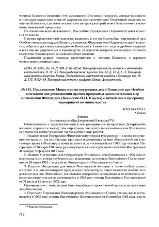 Предложение Министерства внутренних дел в Комиссию при Особом совещании для установления проекта программы законодательных мер в отношении Финляндии (Комиссию Н.Н. Корево) о включении в программу мероприятий по министерству. 4(17) мая 1912 г.