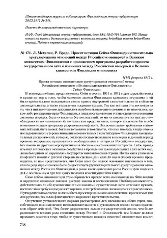 Проект петиции Сейма Финляндии относительно урегулирования отношений между Российскою империей и Великим княжеством Финляндским с приложением программы разработки проекта государственного акта о взаимных между Российской империей и Великим княжеством Финляндии отношениях. 1(14) февраля 1913 г.