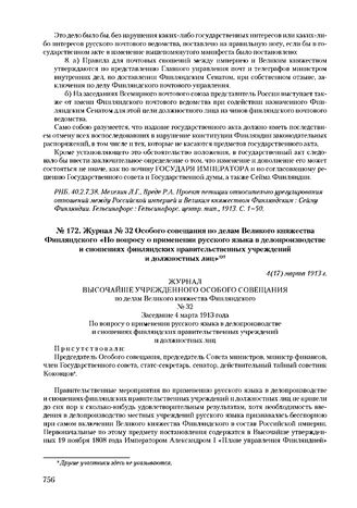 Журнал № 32 Особого совещания по делам Великого княжества Финляндского «По вопросу о применении русского языка в делопроизводстве и сношениях финляндских правительственных учреждений и должностных лиц». 4(17) марта 1913 г.