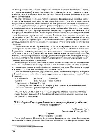 Справка Канцелярии Финляндского генерал-губернатора «Финно-угорское общество». 3(16) марта 1914 г. // НАФ. Фонд Канцелярия генерал-губернатора, дело 26-В-11/I/1914, папка 908. Машинопись на листах.