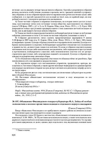 Объявление Финляндского генерал-губернатора Ф.А. Зейна об особых полномочиях в военное время чинов полиции и отдельного корпуса жандармов. 23 июля (5 августа) 1914 г. // Опубл.: Финляндская газета. 1914, 24 июля (в августа). № 164. С. 1; Сборник узаконений, а также мер и распоряжений правительства, изданных по Финляндии на время войны... Пг., 1916. С. 9.