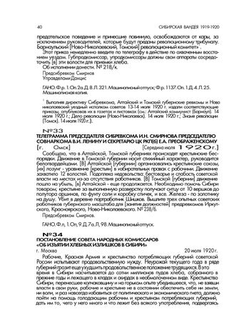 Телеграмма председателя Сибревкома И.Н. Смирнова председателю Совнаркома В.И. Ленину и секретарю ЦК РКП(б) Е.А. Преображенскому. [г. Омск]. Середина июля 1920 г. // ГАНО. Ф.п. 1. Оп. 9. Д. 7а. Л. 98. Машинописный отпуск.