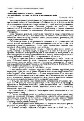 Приказ Сибревкома № 254 о создании чрезвычайных троек по борьбе с контрреволюцией. г. Омск. 25 августа 1920 г. // ГАНО. Ф.р. 1. Оп. 2. Д. 23. Л. 118. Машинописная копия.