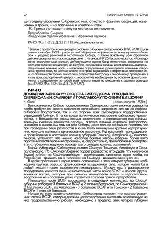Докладная записка руководства Сибпродкома председателю Сибревкома И.Н. Смирнову и Помглавкому по Сибири В.И. Шорину. г. Омск. Конец августа 1920 г. // ГАНО. Ф.р. 1. Оп. 2. Д. 23. Л. 235. Машинописный подлинник.