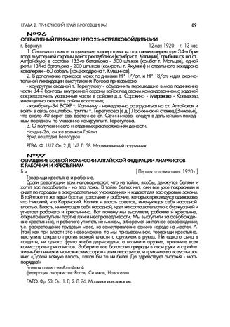 Обращение боевой комиссии Алтайской федерации анархистов к рабочим и крестьянам. Первая половина мая 1920 г. // ГАТО. Ф.р. 53. Оп. 1. Д. 2. Л. 76. Машинописная копия.