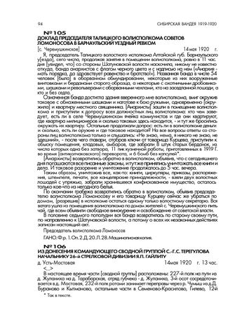 Из донесения командующего сводной группой С.-Г.С. Терегулова начальнику 26-й стрелковой дивизии Я.П. Гайлиту. д. Усть-Мостовая. 14 мая 1920 г ., 13 час // РГВА. Ф. 1317. Оп. 2. Д. 147. Л. 92. Машинописная дешифровка.