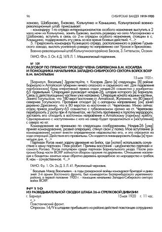 Из разведывательной сводки штаба 26-й стрелковой дивизии. г. Барнаул. 15 мая 1920 г., 11 час // РГВА. Ф. 1317. Оп. 2. Д. 938. Лл. 29, 30. Машинописная копия.