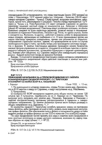Приказание начальника 26-й стрелковой дивизии Я Л. Гайлита командующему сводной группой С.-Г.С. Терегулову и комбригу-65 войск ВОХР Ф.А. Пасынкову. г. Барнаул. 15 мая 1920 г. // РГВА. Ф. 1317. Оп. 2. Д. 147. Л. 94. Машинописный подлинник.