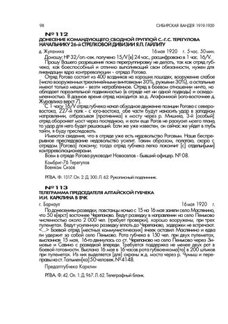 Донесение командующего сводной группой С.-Г.С. Терегулова начальнику 26-й стрелковой дивизии Я.П. Гайлиту. д. Жуланиха. 16 мая 1920 г., 5 час. 50 мин // РГВА. Ф. 1317. Оп. 2. Д. 300. Л. 62. Рукописный подлинник.