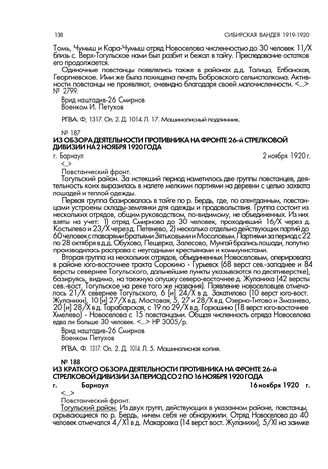 Из краткого обзора деятельности противника на фронте 26-й стрелковой дивизии за период со 2 по 16 ноября 1920 года. г. Барнаул. 16 ноября 1920 г. // РГВА. Ф. 1317. Оп. 2. Д. 1014. Л. 40. Машинописная копия.