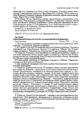 Оперативный приказ № 029 по 13-й кавалерийской дивизии. г. Семипалатинск. 15 июля 1920 г., 21 час // РГВА. Ф. 1494. Оп. 1. Д. 79. Л. 49. Машинописная копия.