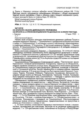 Из краткого обзора деятельности противника на фронте 26-й стрелковой дивизии по данным к 16 июля 1920 года. г. Барнаул. 17 июля 1920 г.