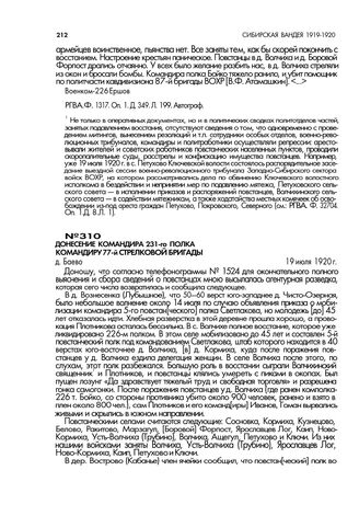 Донесение командира 231-го полка командиру 77-й стрелковой бригады. д. Баево. 19 июля 1920 г. // РГВА. Ф. 1319. Оп. 1. Д. 183. Л. 236. Рукописный подлинник.