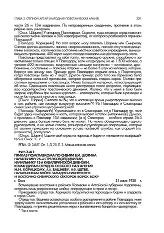 Приказ Помглавкома по Сибири В.И. Шорина начальнику 26-й стрелковой дивизии, начальнику 13-й кавалерийской дивизии, командирам отрядов особого назначения Н.И. Корицкому, А.А. Вашневу, Н.Ф. Цетве, начальникам войск Западно-Сибирского и Восточно-Сибирского секторов ВОХР. г. Омск. 31 июля 1920 г.