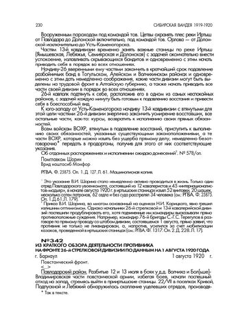 Из краткого обзора деятельности противника на фронте 26-й стрелковой дивизии по данным на 1 августа 1920 года. г. Барнаул. 1 августа 1920 г. // РГВА. Ф. 1317. Оп. 2. Д. 1011. Лл. 2, 3. Машинописный подлинник.