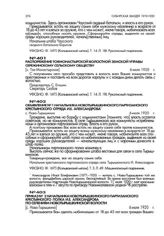 Объявление № 1 начальника Ново-Тырышкинского партизанского крестьянского отряда И.Е. Александрова. с. Ново-Тырышкино. 6 июля 1920 г. // УФСБНО. Ф. 16975 (Колыванский мятеж). Т. 3. Л. 49. Машинописный подлинник.