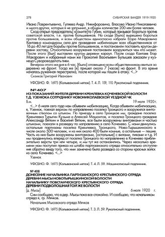 Из показаний жителя деревни Кремлевка Коченевской волости Т.А. Узенюка сотруднику Ново-Николаевской уездной ЧК. 19 июля 1920 г. // УФСБНО. Ф. 16975 (Колыванский мятеж). Т. 4. Л. 59. Машинописный подлинник.