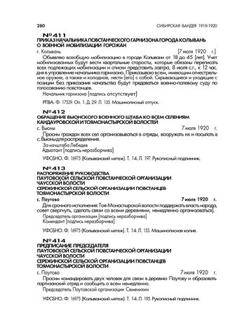 Распоряжение руководства Шутовской сельской повстанческой организации Чаусской волости Сережинской сельской организации повстанцев Тоя-Монастырской волости. с. Паутово. 7 июля 1920 г. // УФСБНО. Ф. 16975 (Колыванский мятеж). Т. 14. Л. 153. Машинописная копия.