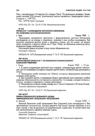 Приказ № 1 коменданта Чаусского гарнизона по селениям Чаусской волости. с. Чаус. 8 июля 1920 г. // УФСБНО. Ф. 16975 (Колыванский мятеж). Т. 14. Л. 192. Рукописный подлинник.