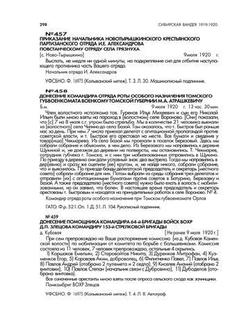 Донесение командира отряда роты особого назначения Томского губвоенкомата военкому Томской губернии М.А. Атрашкевичу. 9 июля 1920г., 13 час. 30 мин // ГАТО. Ф.р. 521. Оп. 1. Д. 51. Л. 104. Рукописный подлинник.
