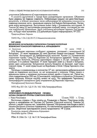 Донесение начальника гарнизона станции Болотная военкому Томской губернии. ст. Болотное. 12 июля 1920 г. // ГАТО. Ф.р. 521. Оп. 1. Д. 51. Лл. 163, 163а. Телеграфный бланк.