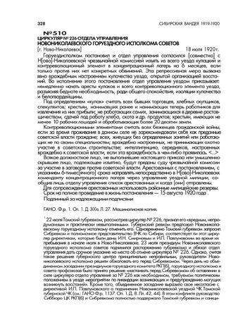 Циркуляр № 226 отдела управления Ново-Николаевского горуездного исполкома советов. [г. Ново-Николаевск]. 18 июля 1920 г. // ГАНО. Ф.р. 1. Оп. 1. Д 300а. Л. 27. Машинописная копия.