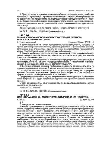 Приказ военкома Ново-Николаевского уезда П.Р. Чепалова всем волостным военкомам. [г. Ново-Николаевск]. Не ранее 18 июля 1920 г. // ГАНО. Ф.р. 1293. Оп. 1. Д. 2. Л. 5. Машинописная копия.