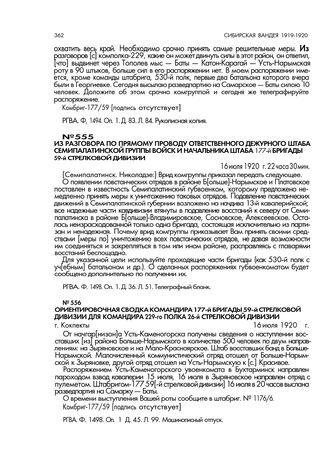 Ориентировочная сводка командира 177-й бригады 59-й стрелковой дивизии для командира 229-го полка 26-й стрелковой дивизии. г. Кокпекты. 16 июля 1920 г. // РГВА. Ф. 1498. Оп. 1. Д. 45. Л. 99. Машинописный отпуск.