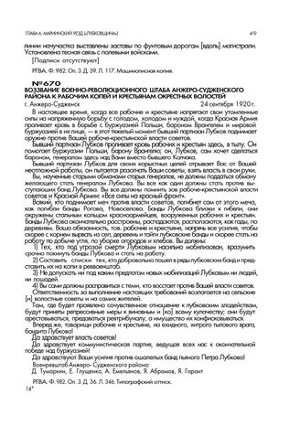 Воззвание военно-революционного штаба Анжеро-Судженского района к рабочим копей и крестьянам окрестных волостей. г. Анжеро-Судженск. 24 сентября 1920 г. // РГВА. Ф. 982. Оп. 3. Д. 36. Л. 346. Типографский оттиск.