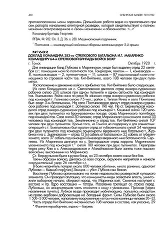 Доклад командира 383-го стрелкового батальона И.Г. Макаренко командиру 64-й стрелковой бригады войск ВОХР. г. Томск. Октябрь 1920 г. // РГВА. Ф. 17534. Оп. 1. Д. 70. Л. 90. Машинописная копия.
