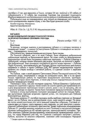 Из двухнедельной сводки Томской губчека за вторую половину сентября 1920 года. г. Томск. Начало октября 1920 г. // ТОЦДНИ. Ф. 1. Оп. 1. Д. 317. Лл. 145—148. Машинописный отпуск.