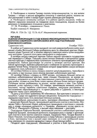 Газетная информация о суде военного революционного трибунала Восточно-Сибирского сектора войск ВНУС над участниками лубковского мятежа. Судженские копи. 8 ноября 1920 г. // Опубликовано: Красноярский рабочий. 7 декабря 1920 г.