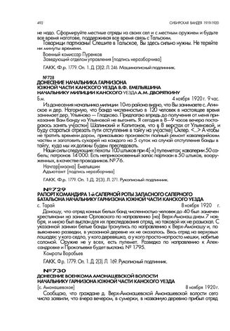 Рапорт командира 1-й саперной роты запасного саперного батальона начальнику гарнизона южной части Канского уезда. с. Тарай. 8 ноября 1920 г. // ГАКК. Ф.р. 1779. Оп. 1. Д. 2(3). Л. 169. Рукописный подлинник.