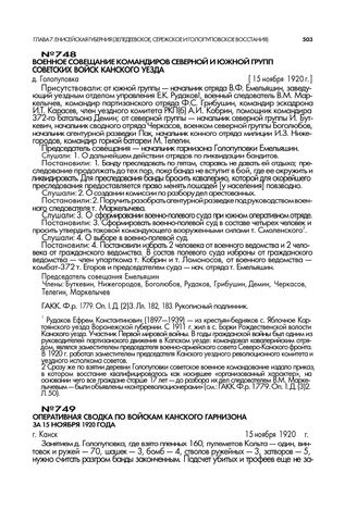 Оперативная сводка по войскам Канского гарнизона за 15 ноября 1920 года. г. Канск. 15 ноября 1920 г. // РГВА. Ф. 982. Оп. 3. Д. 36. Л. 528. Машинописная копия.