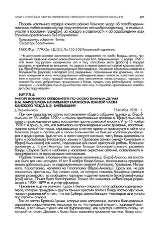 Рапорт военного следователя по особо важным делам В.М. Маркелычева начальнику гарнизона южной части Канского уезда В.Ф. Емельяшину. д. Верх-Амонаш. 16 ноября 1920 г. // ГАКК. Ф.Р. 1779. Оп. 1. Д. (2)З. Лл. 183-185. Автограф.