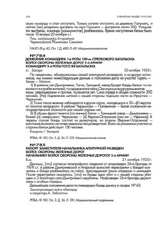 Донесение командира 1-й роты 109-го стрелкового батальона войск обороны железных дорог 5-й армии командиру 3-й роты того же батальона. ст. Залари. 20 октября 1920 г. // РГВА. Ф. 982. Оп. 3. Д. 36. Л. 328. Машинописная копия.