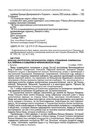Доклад инструктора-организатора отдела управления Сибревкома А.Н. Тетерина о событиях в Черемховском уезде. с. Кутулик. 3 ноября 1920 г.