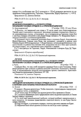 Донесение помощника командира 16-го особого отряда начальнику особых отрядов 35-й стрелковой дивизии. д. Коха. 28 октября 1920 г. // РГВА. Ф. 28174. Оп. 2. Д. 56. Л. 100. Рукописный подлинник.