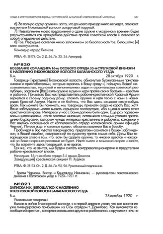 Воззвание командира 16-го особого отряда 35-й стрелковой дивизии к населению Тихоновской волости Балаганского уезда. 28 октября 1920 г. // РГВА. Ф. 28174. Оп. 2. Д. 56. Лл. 95, 96. Рукописный подлинник.
