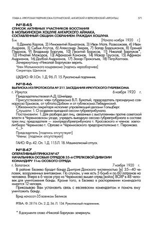 Оперативный приказ № 47 начальника особых отрядов 35-й стрелковой дивизии командиру 11-го особого отряда. г. Балаганск. 7 ноября 1920 г. // РГВА. Ф. 28174. Оп. 2. Д. 56. Л. 134. Рукописный подлинник.