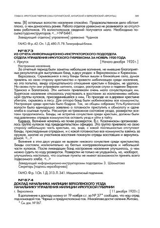 Доклад начальника милиции Верхоленского уезда начальнику управления милиции Иркутской губернии. г. Верхоленск. 11 декабря 1920 г. // ГАНО. Ф.р. 1. Оп. 2а. Д. 4. Л. 83. Машинописная копия.
