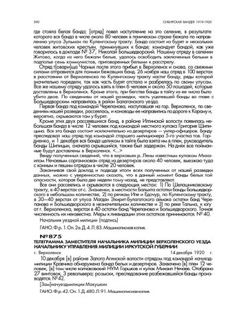Телеграмма заместителя начальника милиции Верхоленского уезда начальнику управления милиции Иркутской губернии. г. Верхоленск. 14 декабря 1920 г. // ГАИО. Ф.р.42. Оп. 1. Д. 480. Л. 91. Машинописная копия.