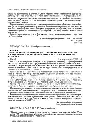 Приказ заместителя заведующего политбюро Ишимского уезда И.В. Недорезова и заместителя тюменского губпродкомиссара Я.З. Маерса. [г. Ишим]. Начало декабря 1920 г. // ИФ ГАТО. Ф. р. 6. Оп. 1. Д. 39. Л. 28. Типографский оттиск.