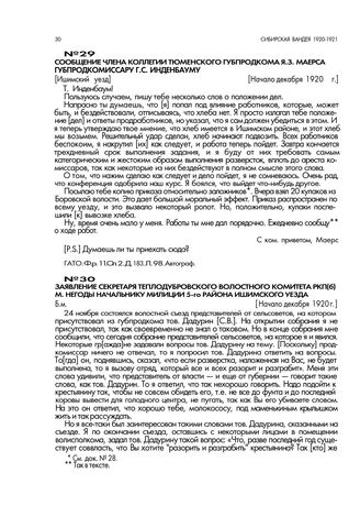 Заявление секретаря Теплодубровского волостного комитета РКП(б) М. Негоды начальнику милиции 5-го района Ишимского уезда. Начало декабря 1920 г. // ГАНО. Ф.п. 1. Оп. 2. Д. 31. Л. 2. Машинописная копия.