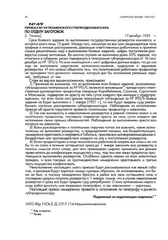 Приказ № 59 Тюменского губпродкомиссара по отделу заготовок. [г. Тюмень]. 17 декабря 1920 г.